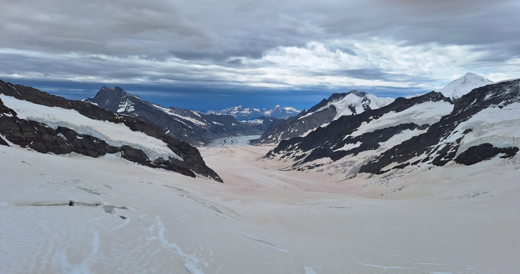 The final leg of our journey bore us into the very innards of the mountains. The ascent through impenetrable darkness was broken up by a ten minute interlude to acclimatize us to the heady altitudes, but this did little to alleviate the nausea we felt as we pulled into the cold, cavernous station. After a breathless fifteen minutes spent in a state of semi-panic, we wandered drunkenly into the freezing labyrinth, musing disinterestedly at an array of ice sculptures as we sought out the lift that would carry us to the bracing air and unbounded views of the joch. When we finally tramped onto the snowy shoulder, we felt no less dwarfed by the landscape than we had at Kleine Scheidegg far below. To the north the Oberland dropped in ridges and folds towards the foggy flats of the Swiss Plateau, while south the spectacular Aletsch glacier poured away to a canvas of snowy peaks, steely blue beneath the heavy sky.