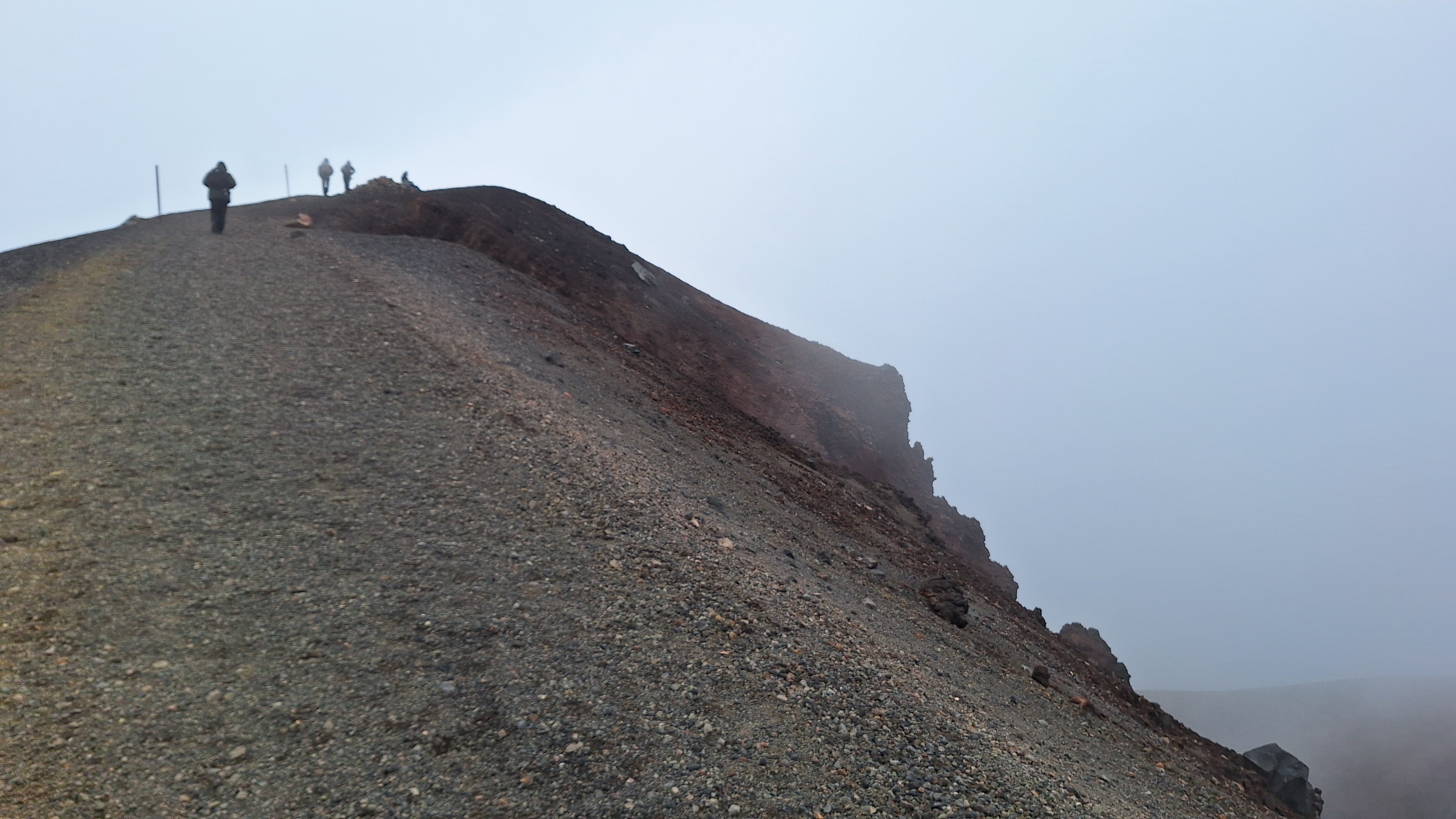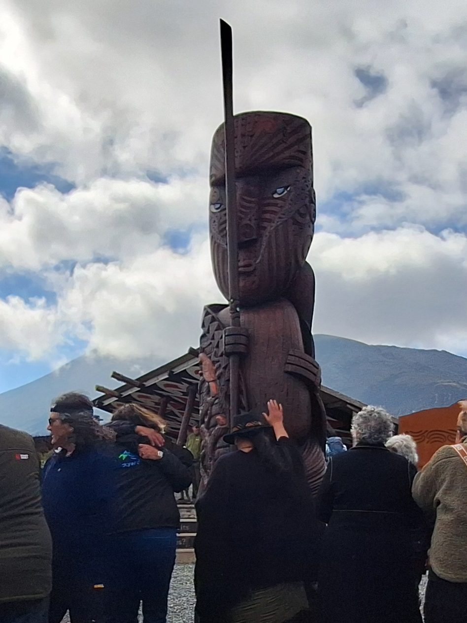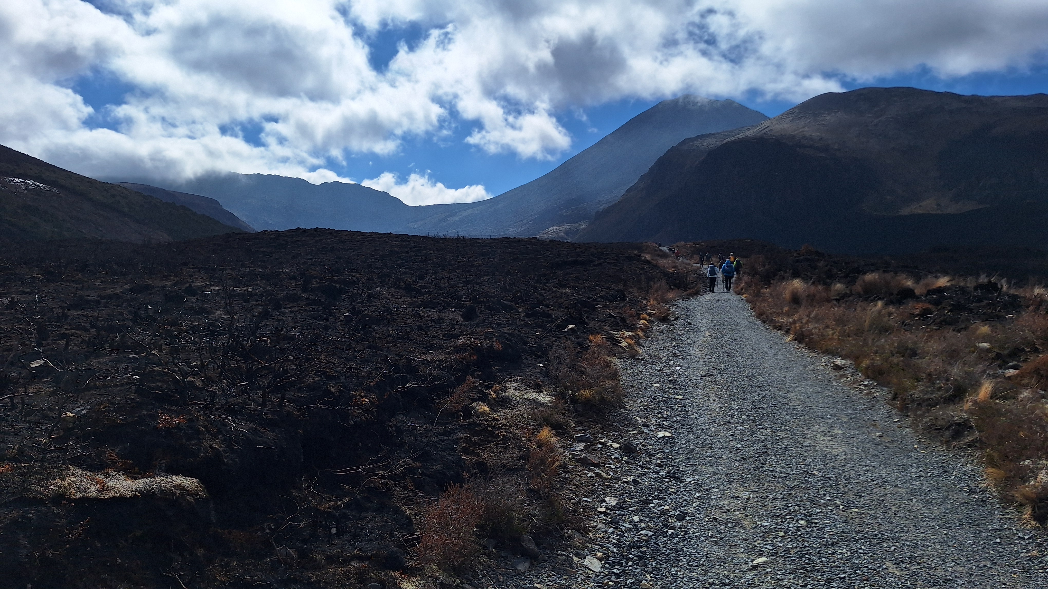 We arrived at the car park, an island of grey concrete in a sea of dark earth, as the reopening ceremony was coming to an end. A line of volunteers dressed in the green uniforms of the Department of Conservation passed beneath the cold gaze of Te Ririō, guardian of the crossing, to exchange hongi with the local Māori dignitaries. Choral song warmed the sub-alpine air as the breath of life was shared between those who had fought and those who had mourned the conflagration. Saying goodbye to Steve, we took our place among the assembly of hikers awkwardly spectating this show of communal grief. Most looked on curiously, interestedly, but some were visibly impatient, pawing at the dusty ground with their boots like bulls preparing to charge.